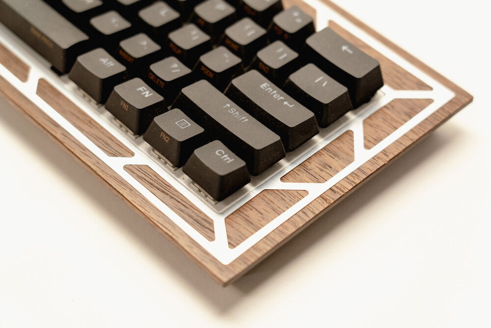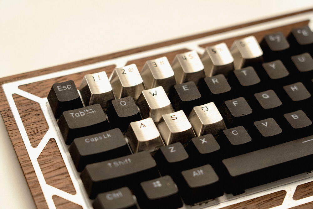 I wanted to mod my Ane Pro 2 to make it match another build and desk I have. I made a new case using Peruvian Walnut wood and changed the most used keys to stainless steel. I made a "truss" design in cad and machine it out of brushed silver aluminum, then machined the inverse in the wood and inlaid it.