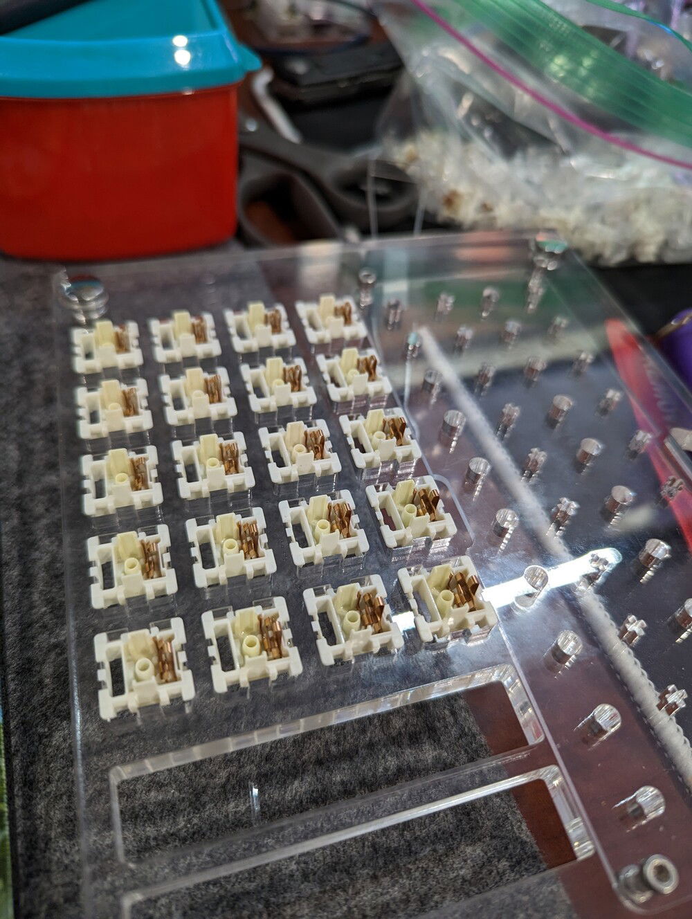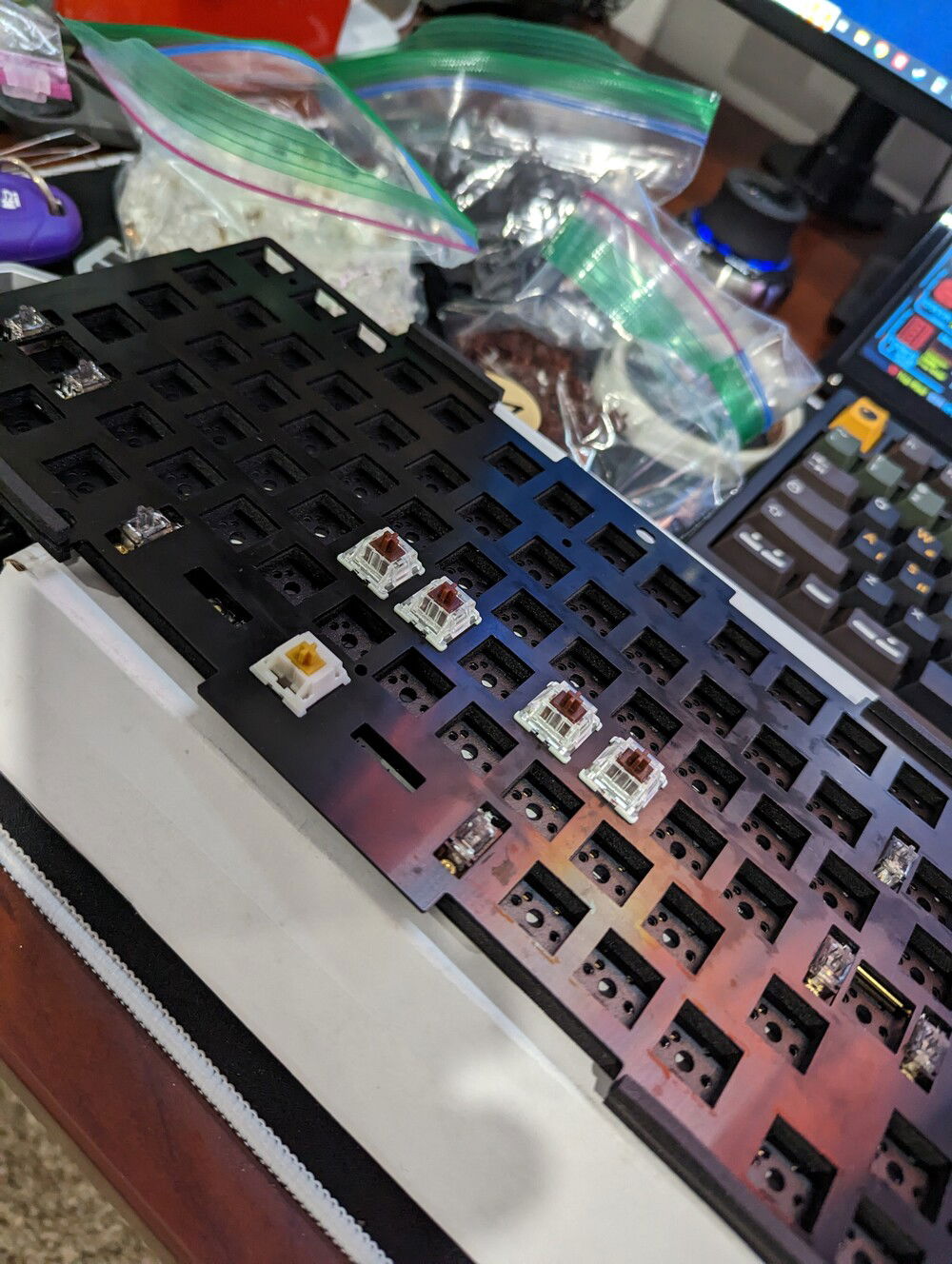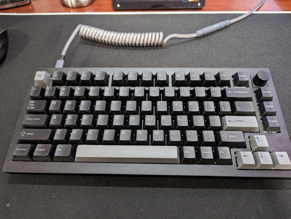 I built and modded this board for my Brother-in-law. It is a Keychron Q1 V2 knob. I put in a POM plate, lubed and filmed the Gat Pro browns, Durock v2s, and Novelkeys keycaps. Sounds amazing, hope he likes it!